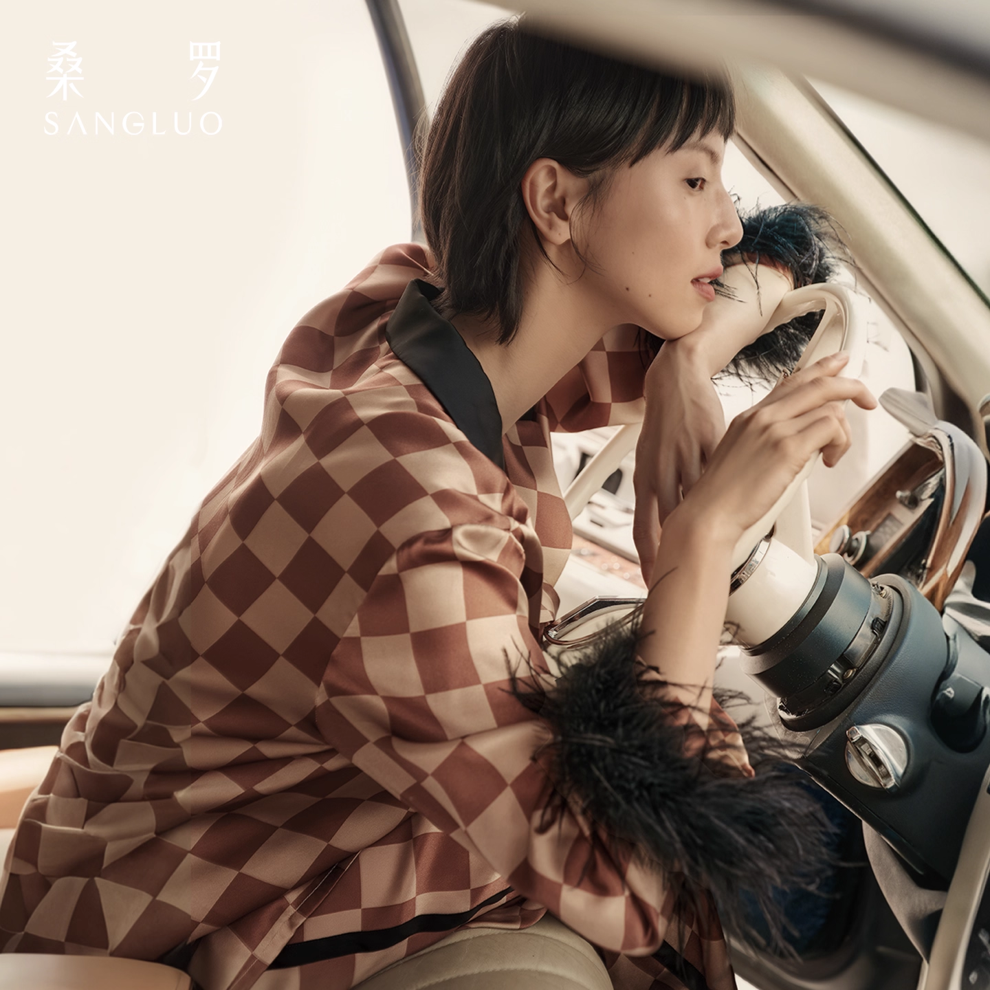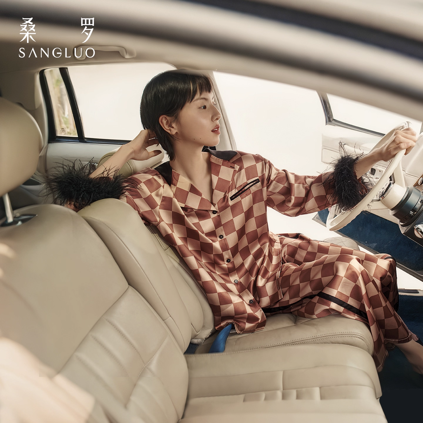 Mocha checkered feather 100% mulberry silk pajamas